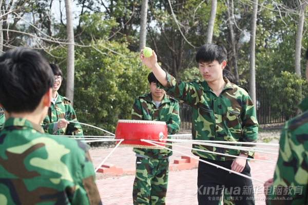 不同于墨守成規的枯燥軍訓,本次軍訓新添了多種拓展項目。“鼓動人心”是一個團隊合作項目,同學們的任務是通過學生牽引連接鼓的繩子,利用鼓面顛球。完成任務要求的顛球數額即為成功,進行下一項拓展。這就要考驗團隊之間的默契及力度掌控,在拓展的過程中,同學們培養了深厚的情誼。