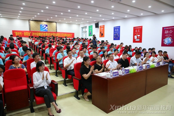 2019年6月19日,“新職業 新專業”2019年秋季新專業發布會暨名企定向班啟動儀式在安徽新華電腦專修學院5號樓一樓報告廳火熱開展。安徽延達智能科技有限公司副總經理陳春景、2020跨境電商總經理孫林、合肥玖聚信息科技有限公司人事總監楊晨晨、新永安網絡公司總經理安定坤、安徽佐卡電子商務有限公司總經理宋榮祥等領導嘉賓共同出席,一同見證2019年秋季新專業發布會暨名企定向班啟動儀式。