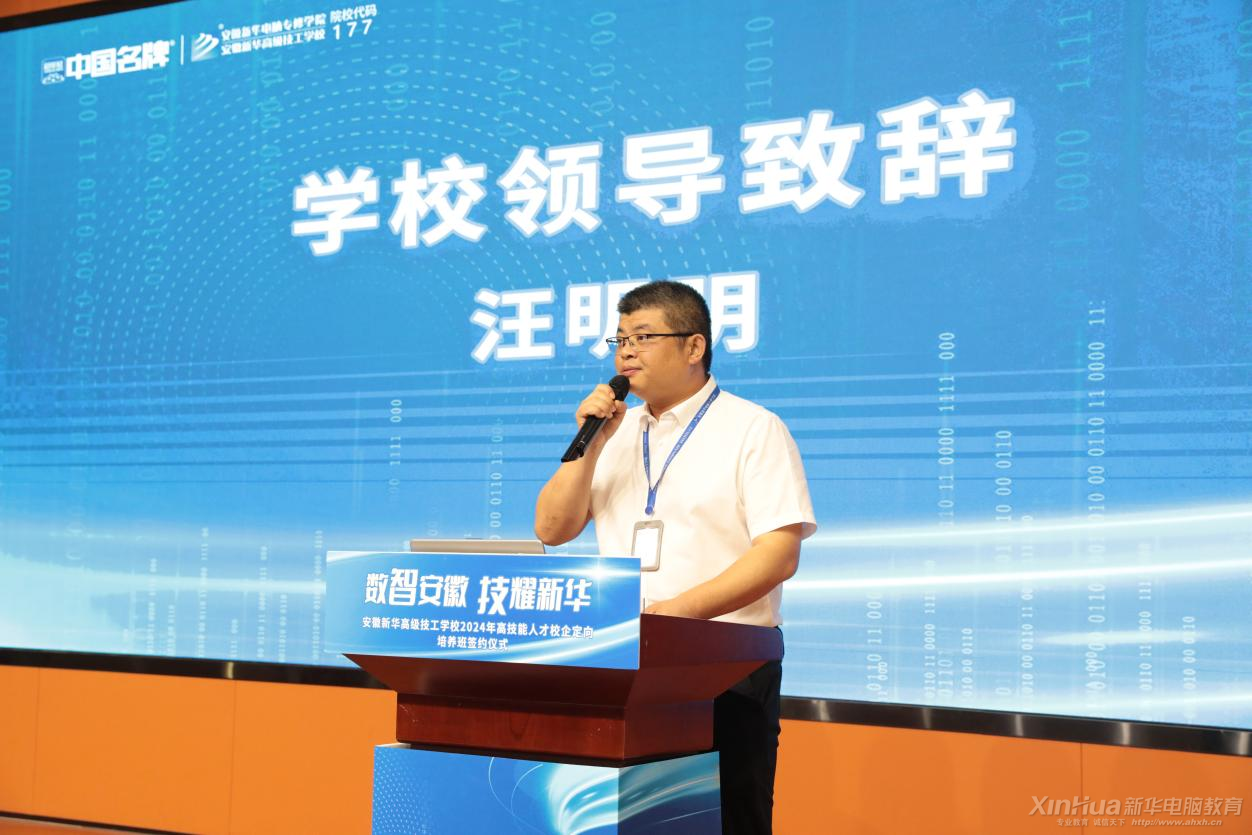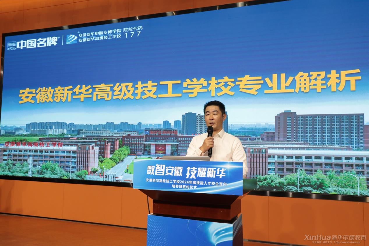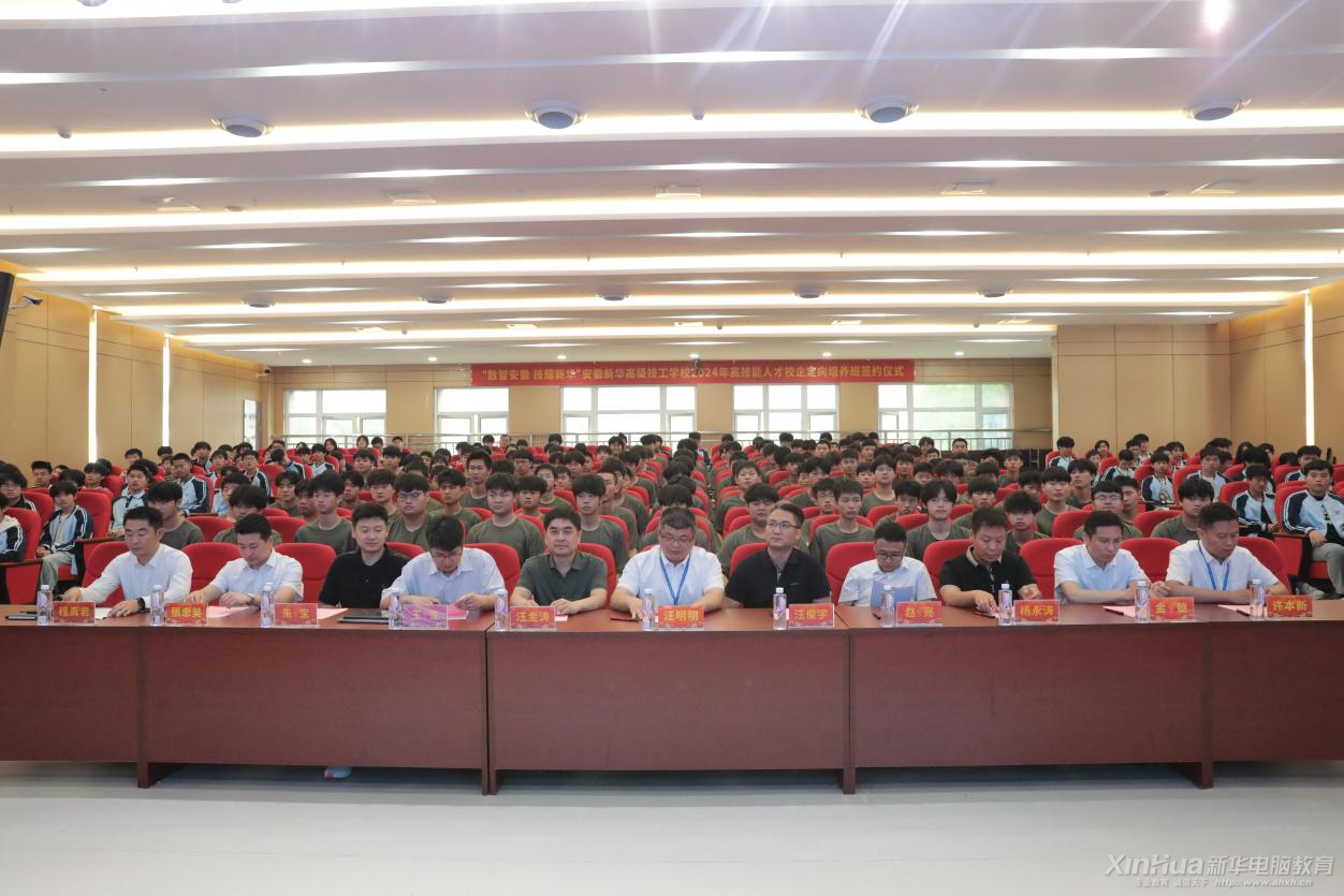 近日,“數智安徽 技耀新華”安徽新華高級技工學校2024年高技能人才校企定向培養班簽約儀式在學校多功能報告廳舉行。校長助理汪明明攜教務處、創就業指導中心主要領導參會,合作企業方代表應邀出席,共同見證。
