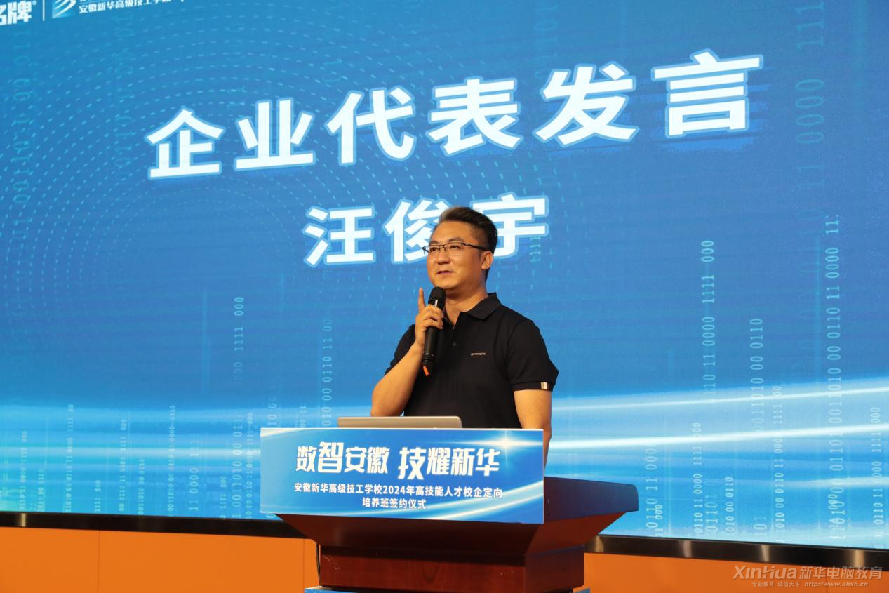 北京慧芃教育科技有限公司總經理汪俊宇作為簽約企業代表發言。他表示,校企合作是實現教育資源和企業資源優化配置的有效途徑,也是培養高素質技能人才的重要平臺。通過與學校的合作,企業可以為學生提供更多的實踐機會和就業渠道,同時也能夠借助學校的師資力量和教學資源,提升企業的技術創新能力和市場競爭力。