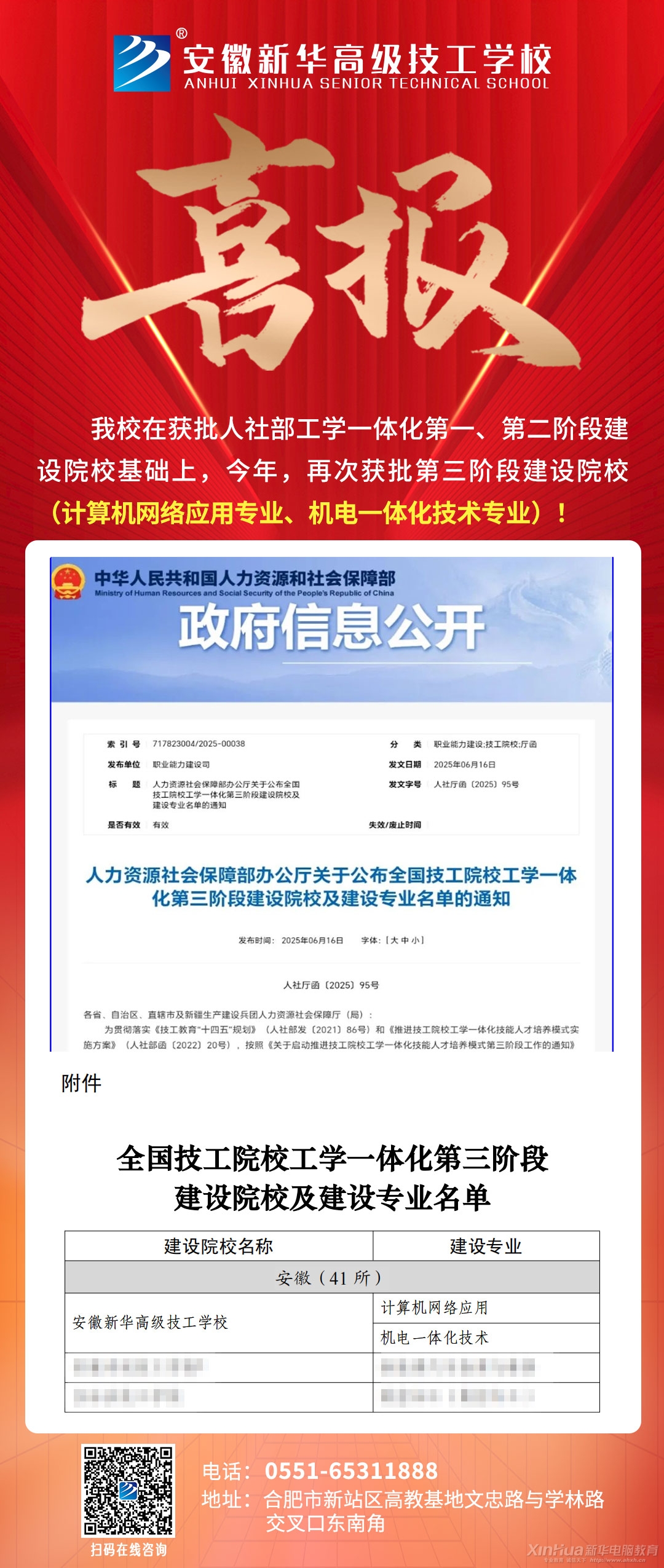 我校在獲批人社部工學一體化第一、第二階段建設院校基礎上,今年,再次獲批第三階段建設院校(計算機網絡應用專業、機電一體化技術專業)!