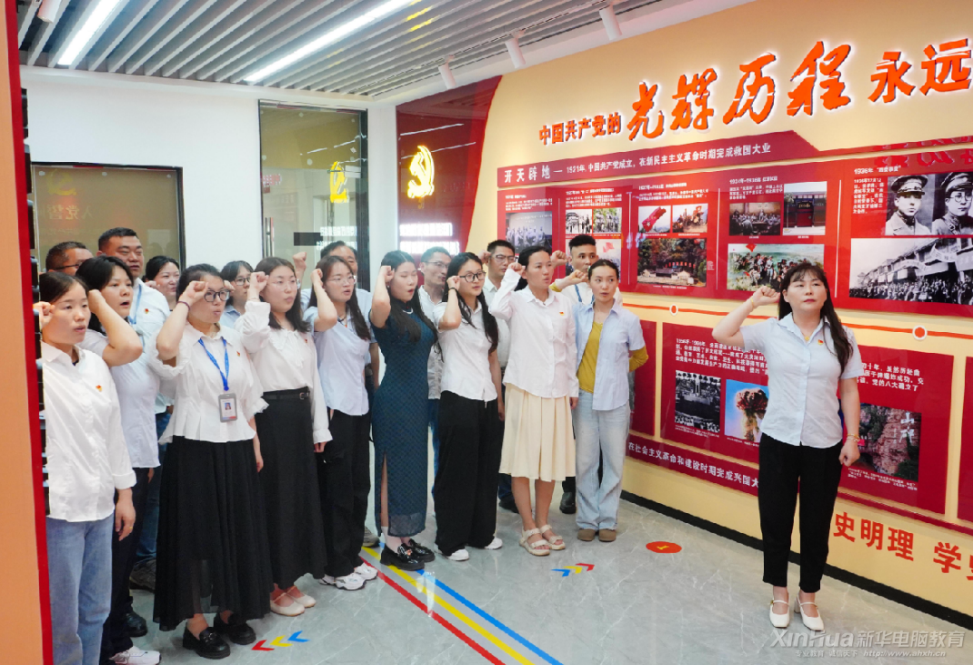 隨后,全體黨員在黨建館舉行了重溫入黨誓詞宣誓活動(dòng),面對(duì)鮮艷的黨旗,全體黨員右拳高擎,莊嚴(yán)宣誓。誓言聲聲入耳、字字入心,既是對(duì)入黨初心的深情回望,更是對(duì)教育使命的鄭重承諾。黨員們表示,將以黨建為引領(lǐng),在工作中沖鋒在前,用 “四有” 好老師的標(biāo)準(zhǔn)踐行初心,用 “立德樹人” 的成效檢驗(yàn)擔(dān)當(dāng)。
