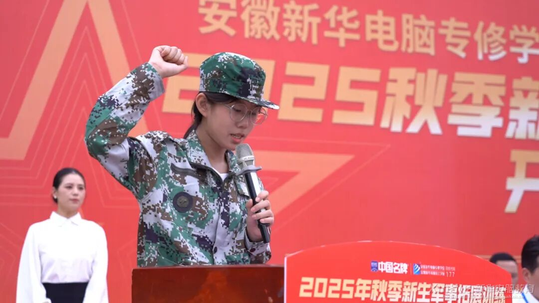 動(dòng)漫2503班李夢(mèng)琪同學(xué)作為新生代表發(fā)言,表達(dá)了迎接軍訓(xùn)挑戰(zhàn)的決心。她帶領(lǐng)全體新生莊嚴(yán)承諾:必將以飽滿的熱情投入訓(xùn)練,遵守紀(jì)律,服從命令,磨煉堅(jiān)強(qiáng)意志,培養(yǎng)優(yōu)良作風(fēng),以優(yōu)異的訓(xùn)練成績(jī)向?qū)W校、向教官、向家長(zhǎng)匯報(bào)。