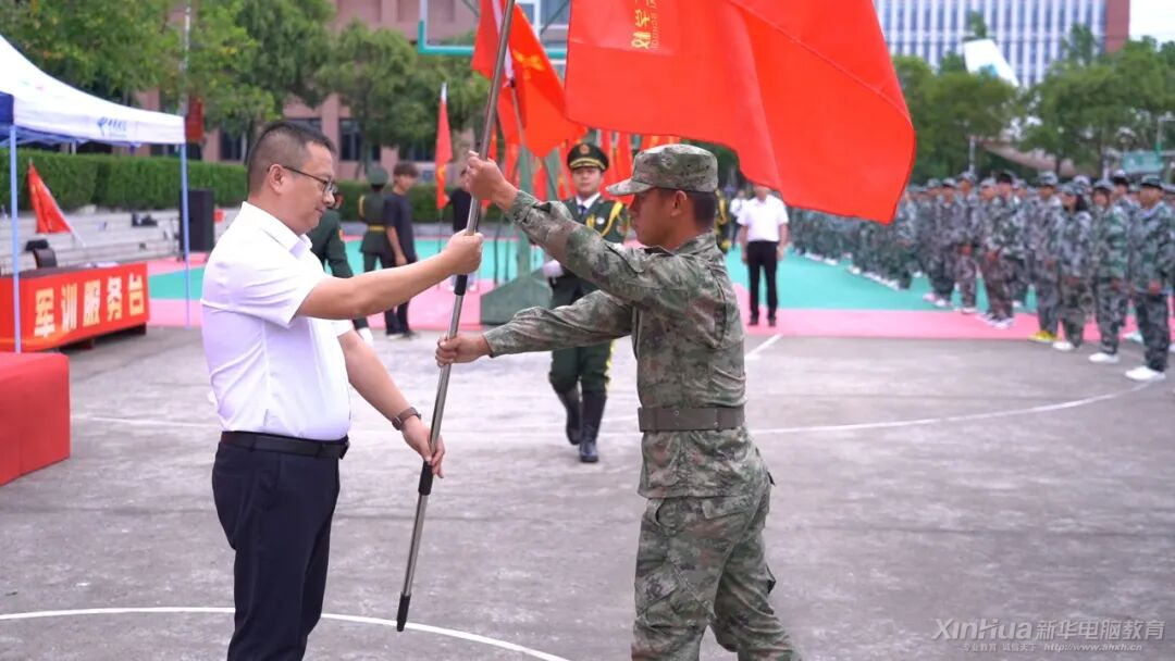 在激昂的樂曲聲中,校長(zhǎng)助理盛文兵向軍訓(xùn)團(tuán)授旗。旗幟不僅是榮譽(yù)和象征,更是責(zé)任與使命的傳遞。接過旗幟,意味著軍事拓展訓(xùn)練任務(wù)的正式開始,也標(biāo)志著一段錘煉與成長(zhǎng)之旅的啟程。