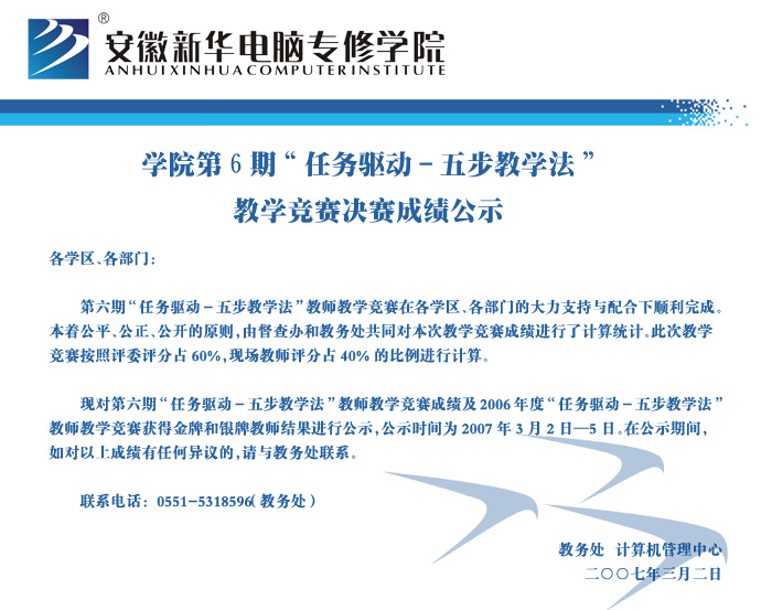 當前位置:首頁 > 新聞中心 > 通知通告 > 學院第6期“任務驅動-五步教學法”教學競賽決賽成績公示
